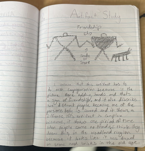 <em>“I believe that this artifact has to do with cooperation because in the picture they’re holding hands and that’s a sign of friendship. It is also describing two different people because one of the person’s bodies is covered and it shows a difference. This artifact is complex because it shows one period of time when people came to trade. I think they drew this in the Woodland region because it looks like it was drawn on stone and bricks in the old age.”</em>